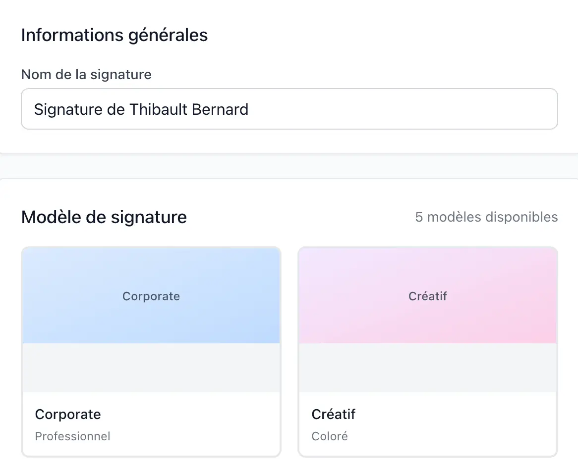 Choisissez parmi une galerie de modèles modernes, ajoutez vos coordonnées, et votre signature est prête. Simple, rapide, efficace.